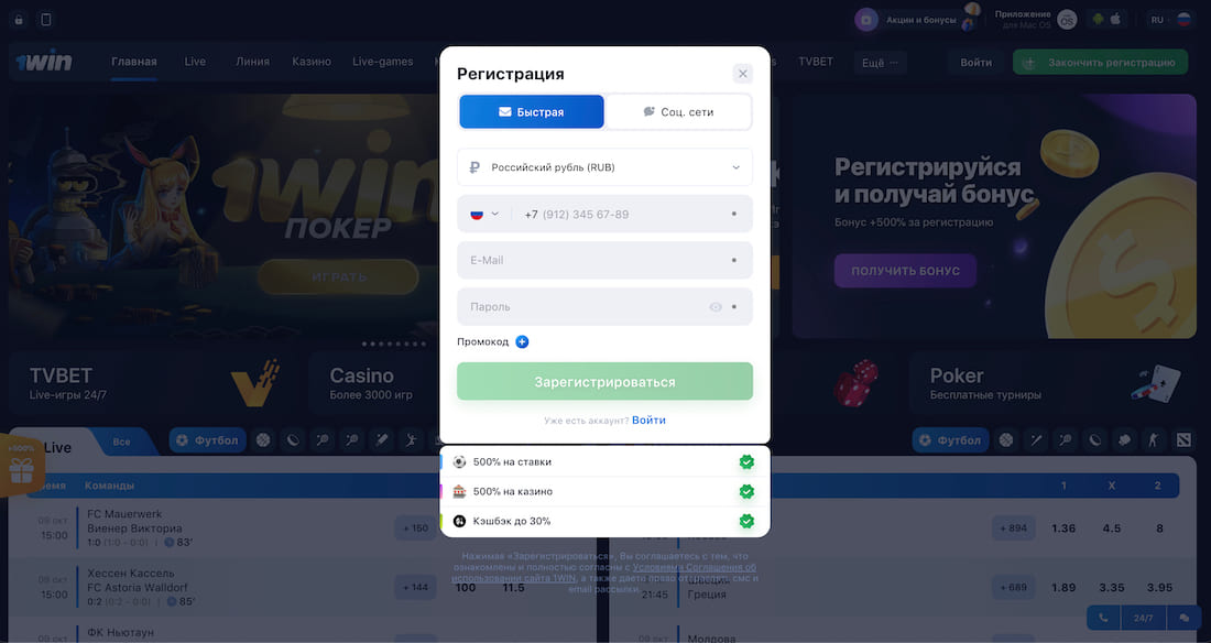 Процесс создания учетной записи доступен как через официальный сайт, так и если перейти на рабочее зеркало 1Win. Способы регистрации включают: